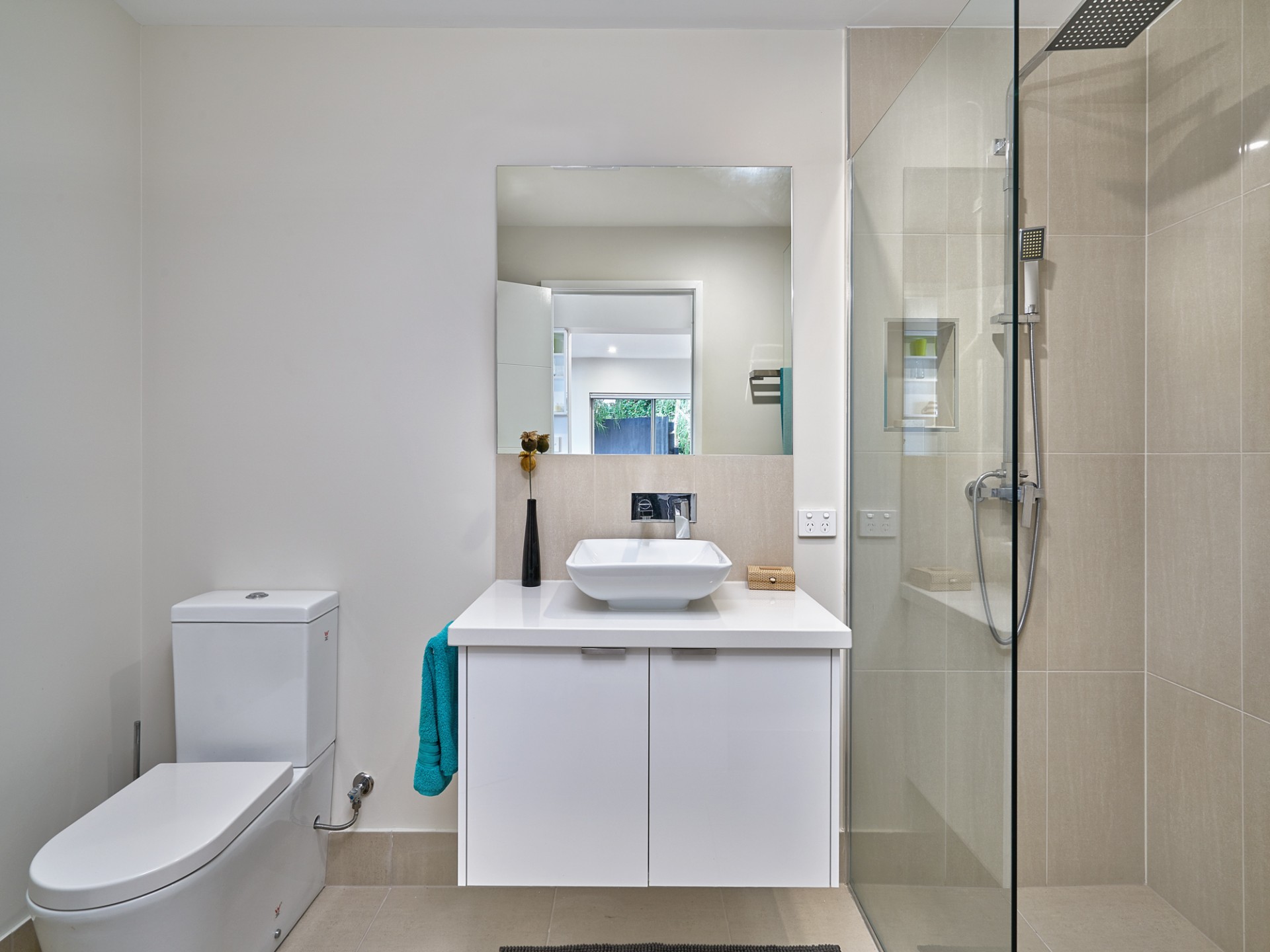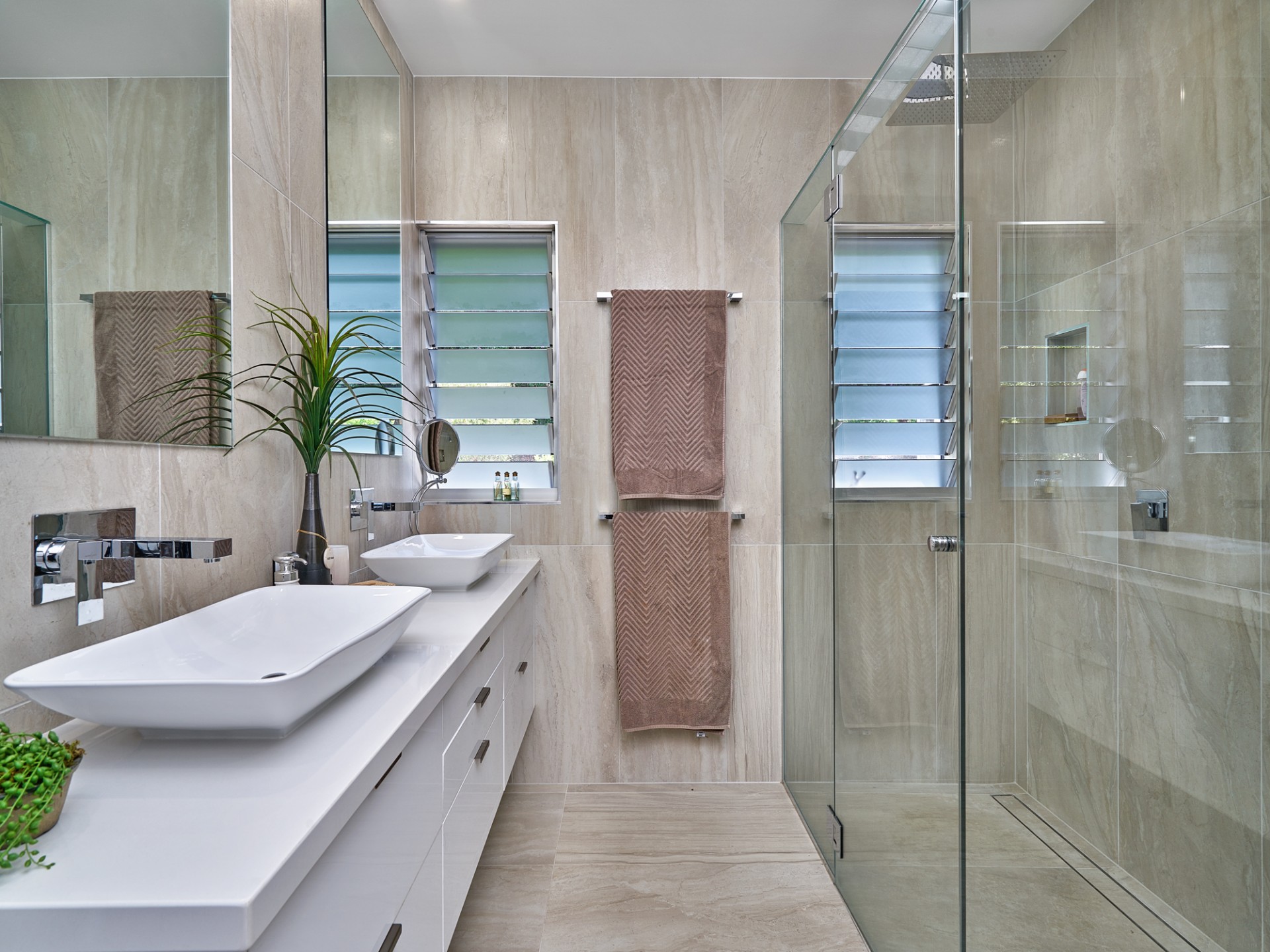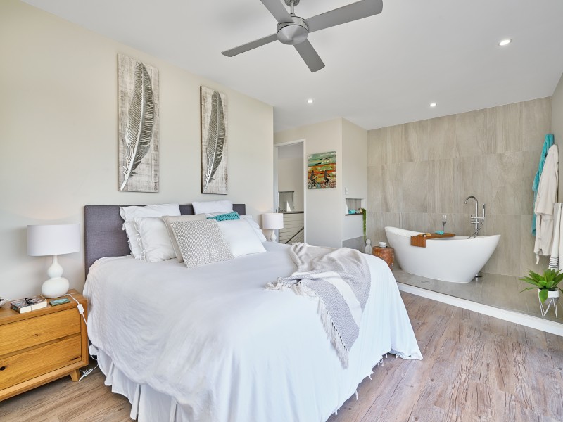 The master suite is stunning ... open the bi-fold doors and wake up to views of the city and mountains ... relax with a wine in the freestanding bath in total privacy or take a shower in the two person walk in shower with a 400 x 400 shower head and there is no shortage of wardrobe space with a walk in robe for her and a 4 bay wardrobe for him.
