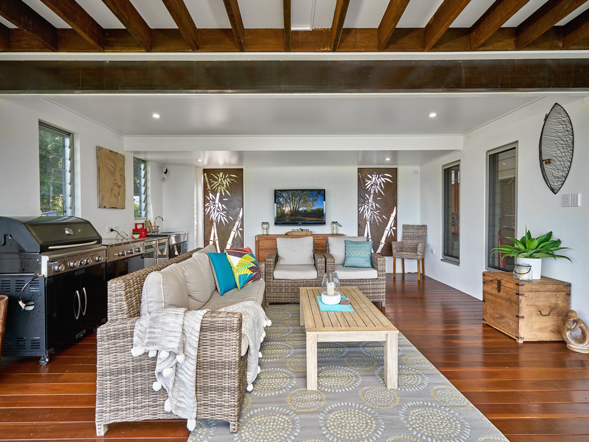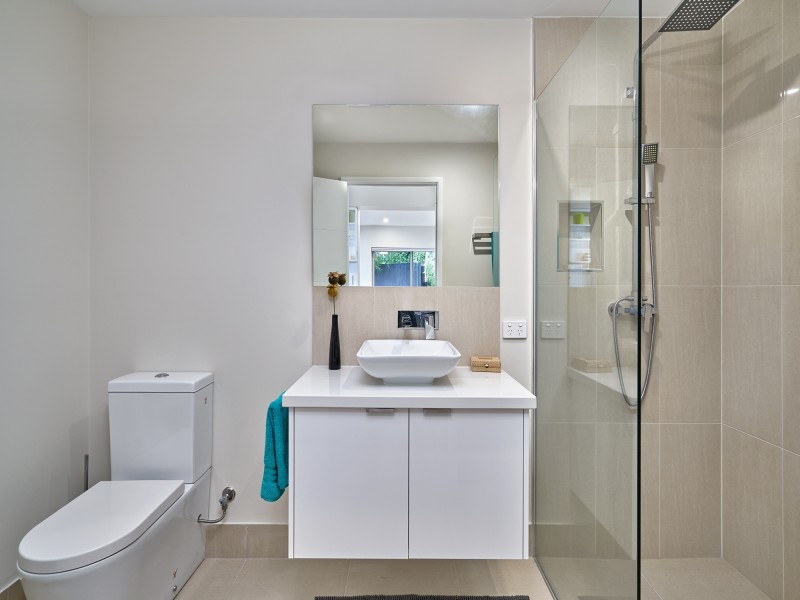Downstairs is a five star self contained studio with kitchenette, ensuite, lounge area and private glass doors to the huge deck and pool area. Perfect for guests/teenagers or extended family.