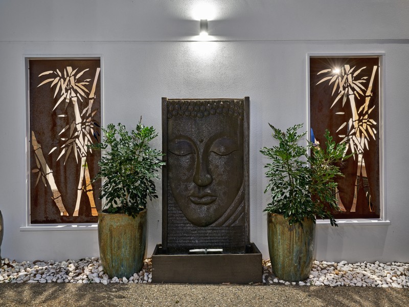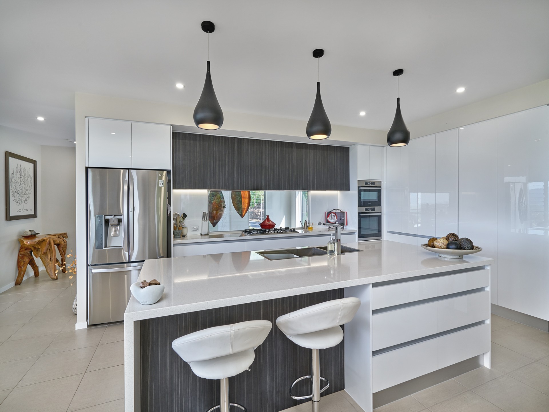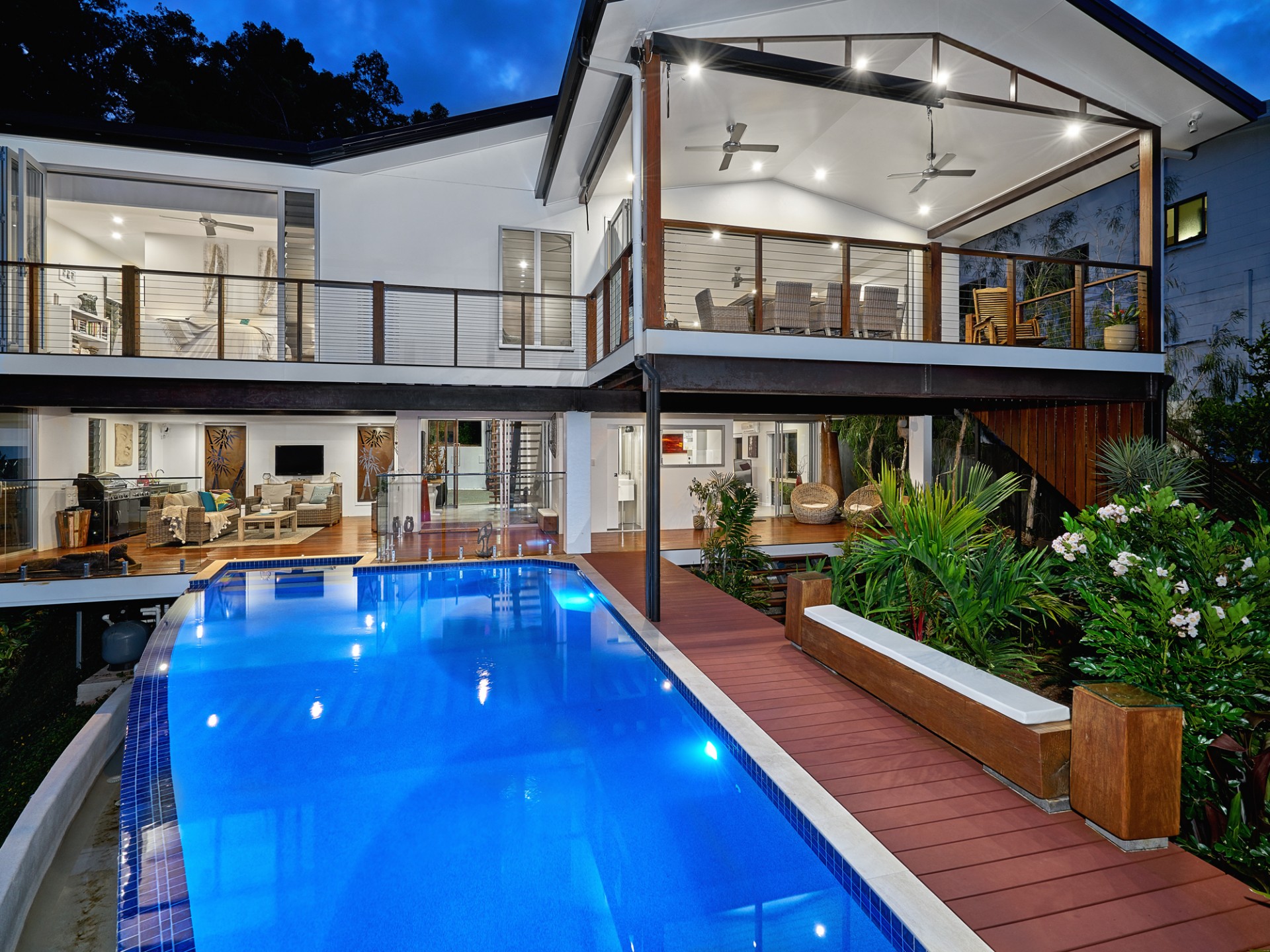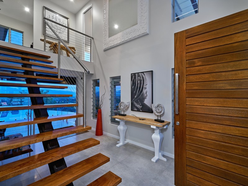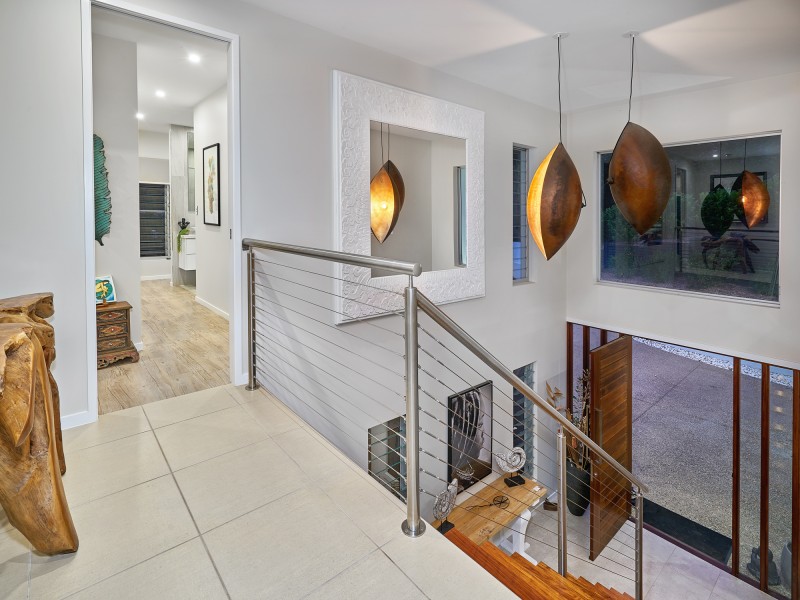 Enter the home into a two storey open foyer with floating Rosewood Stairs, two stunning antique copper pod feature lights and look directly through to the magnesium infinity pool and never ending view.