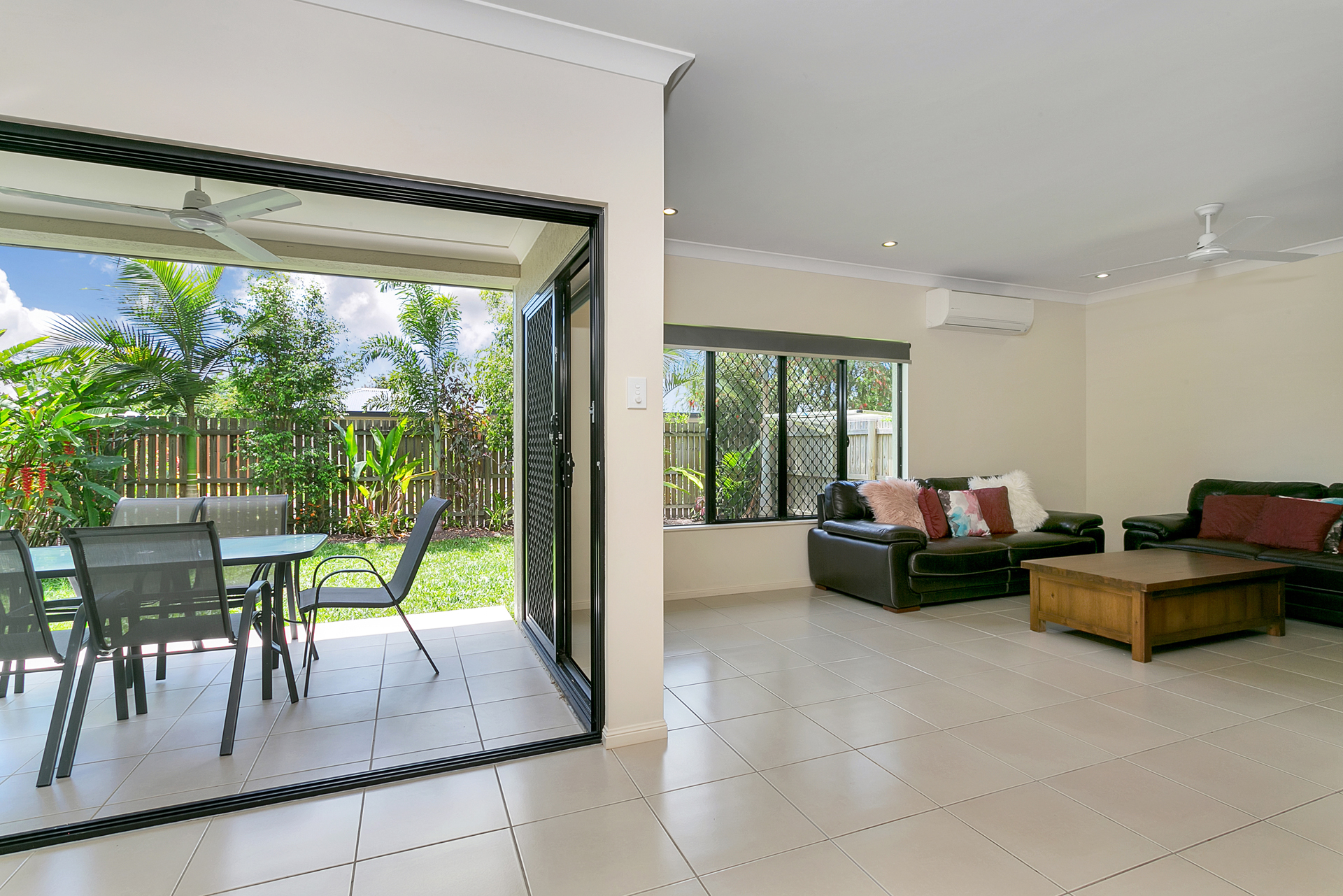 * Big sliding glass doors connecting the indoors with the outdoors