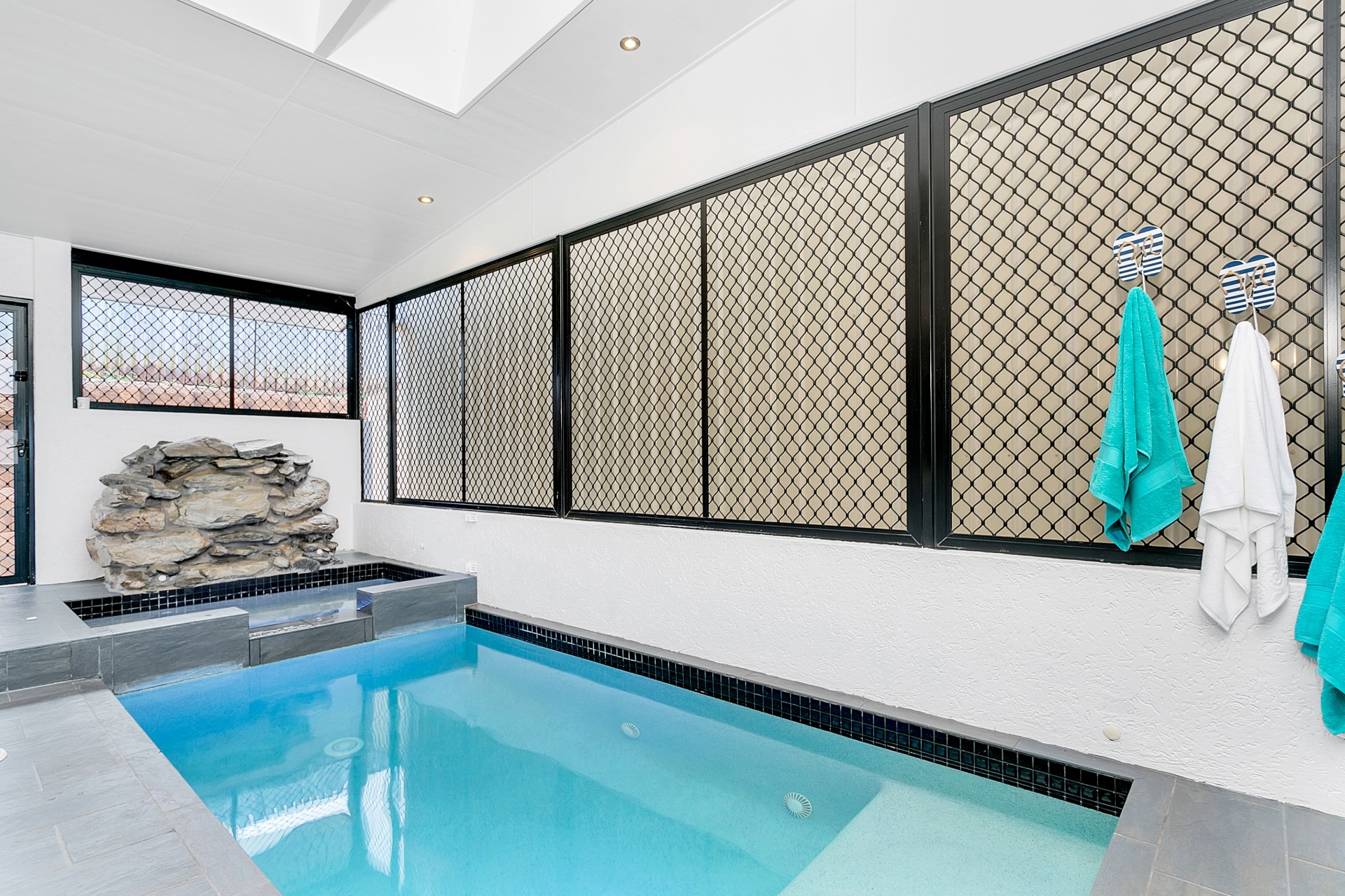 * Indoor Bioniser mineral pool with exercise jet, spa and cover. Heated for those cold winter days and a solar and reverse cycle pump